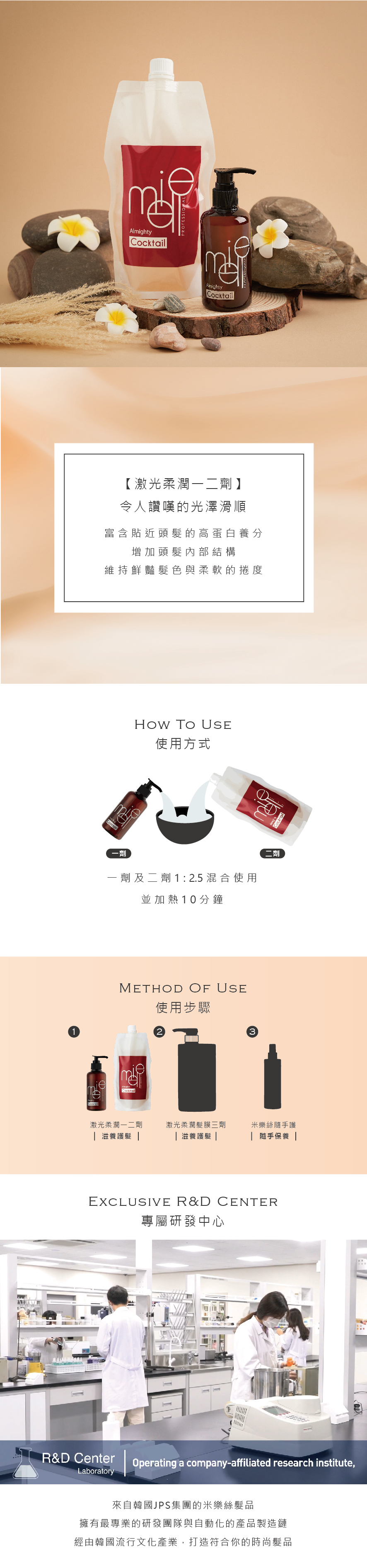 洗髮後,將一號及二號 1:2.5混合使用,並加熱10分鐘。