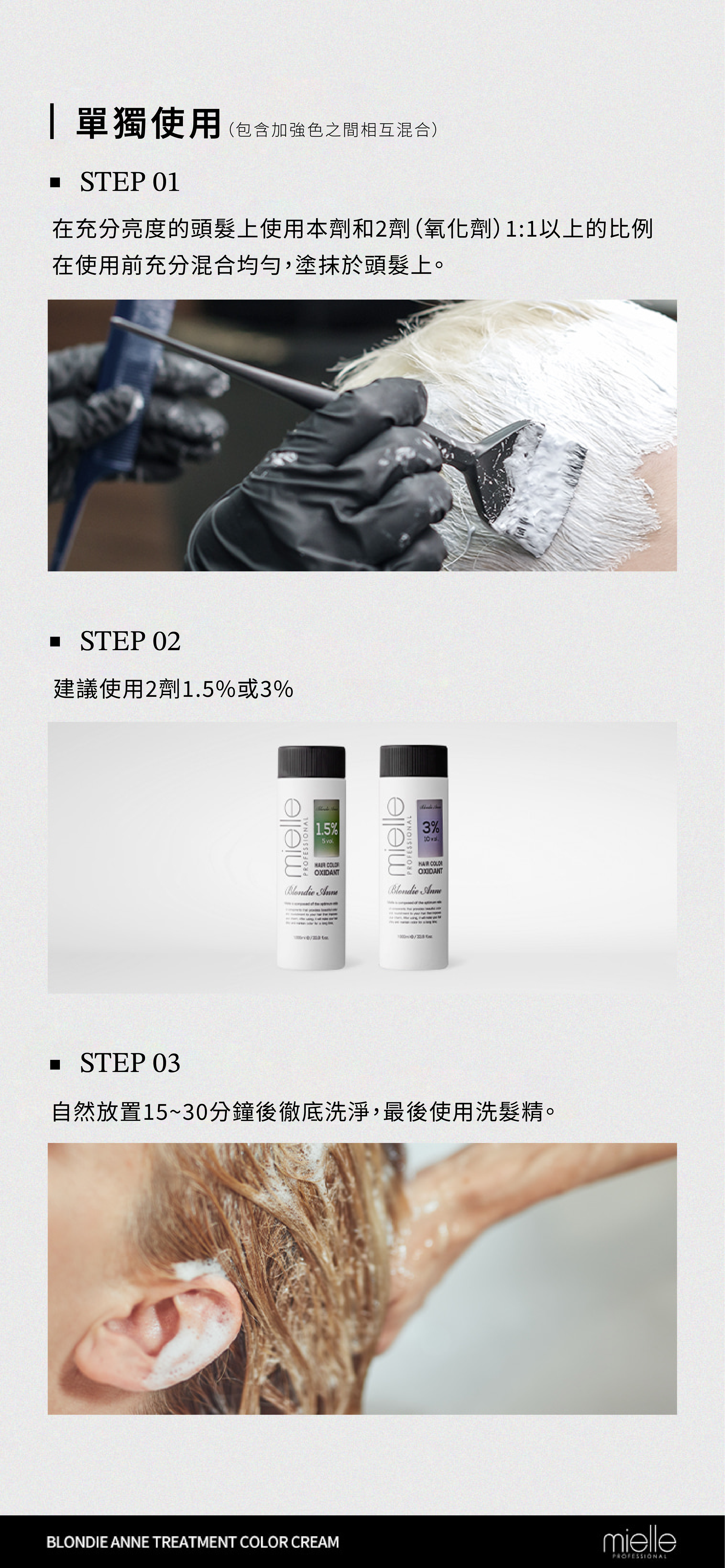 1.使用前將加強色和雙氧乳以 1:1 的比例混合均勻,均勻塗抹頭髮上