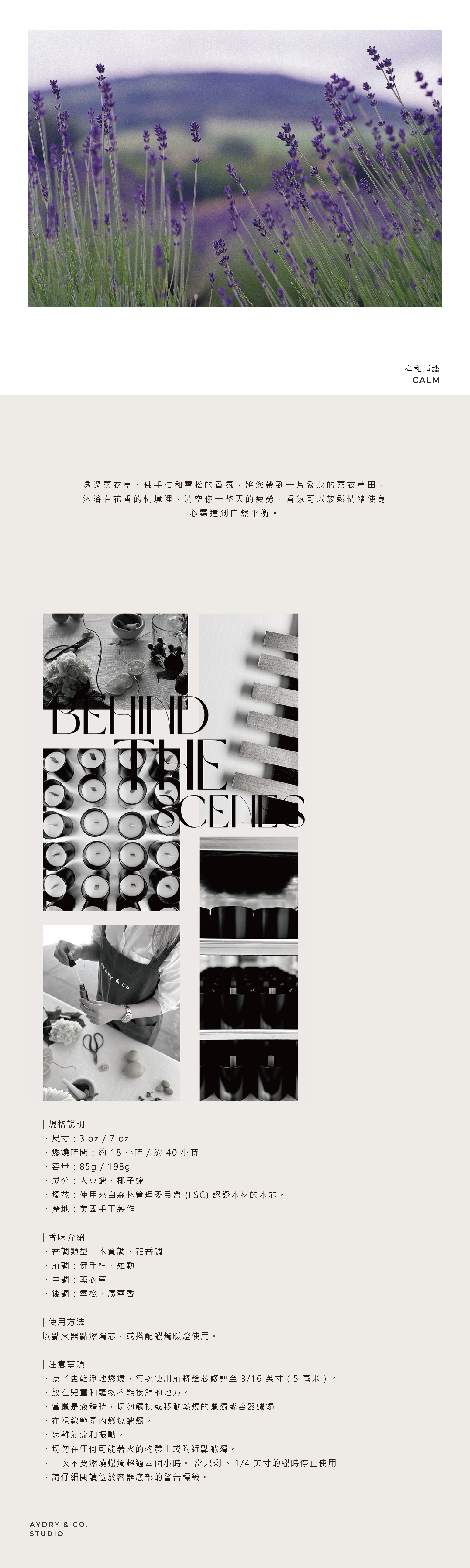 AYDRY&CO 祥和靜謐香氛蠟燭,透過薰衣草、佛手柑和雪松的香氛,將您帶到一片繁茂的薰衣草田,沐浴在花香的情境裡,清空你一整天的疲勞,香氛可以放鬆情緒使身心靈達到自然平衡。