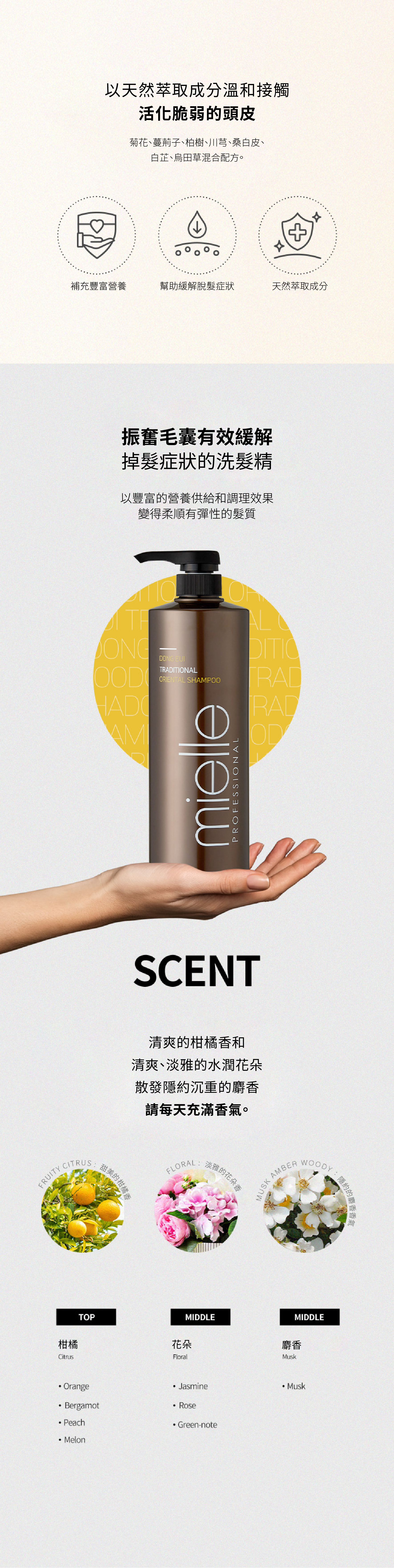 韓國傳統居家洗髮配方,含菊花散、高麗人蔘萃取,溫和不刺激,能提供頭髮滋養及蓬鬆有彈性,並預防白髮生成。