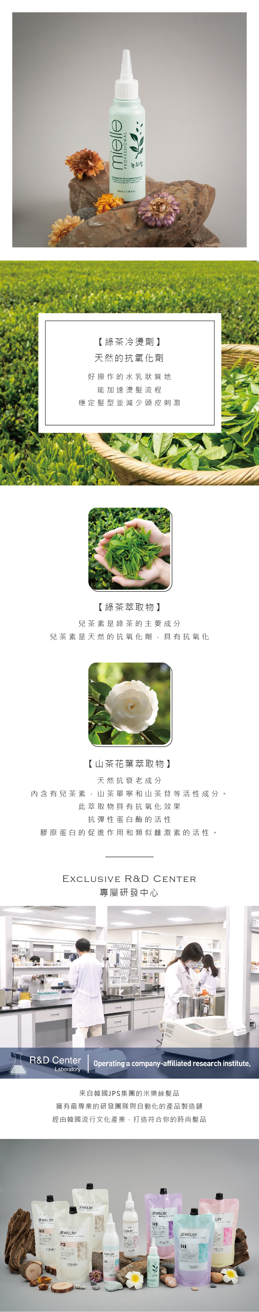 含綠茶萃取物、水解膠原蛋白、山茶花葉萃取物,綠茶萃取物具有抗氧化效果達維他命 C、E 的20倍,能加速燙髮流程,減少頭皮刺激並穩定曲線,適用所有髮質的冷燙藥水。