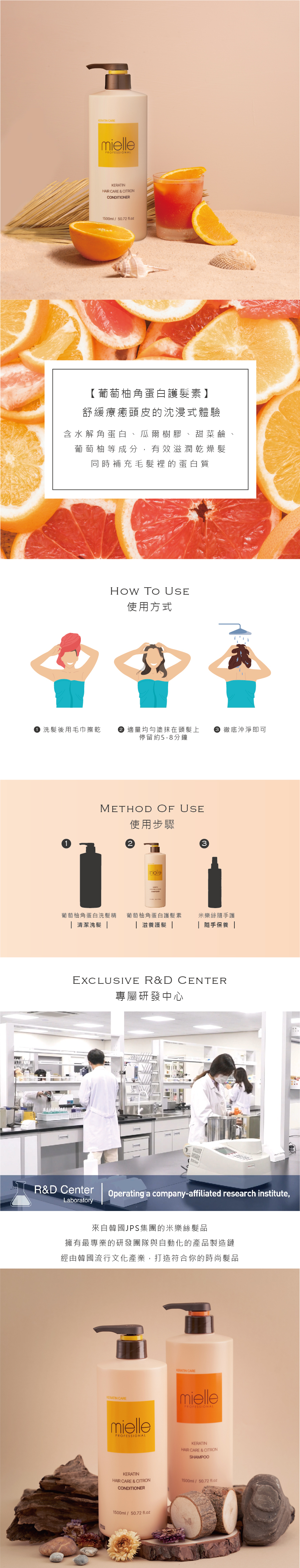 含水解角蛋白、瓜爾樹膠、甜菜鹼、葡萄柚等成分,能有提供乾燥髮水分滋潤並補充毛髮裡的蛋白質,讓髮質健康有光澤。