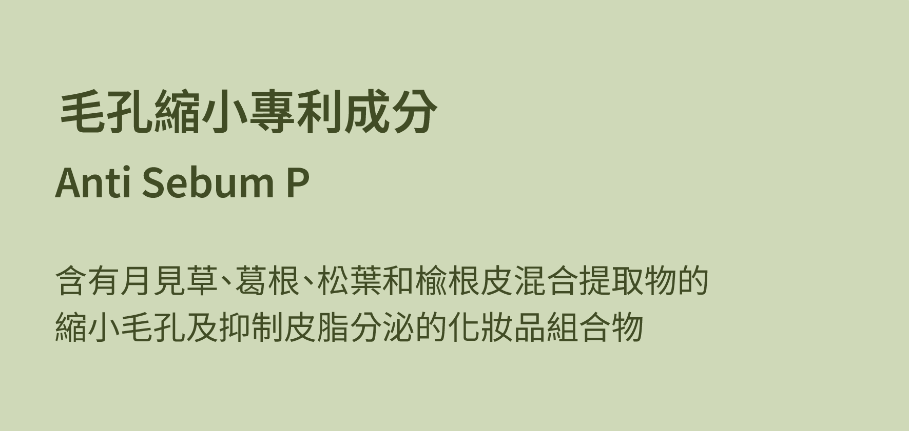 2. 毛孔護理:包含抗皮脂成分 Anti Sebum-P,能夠調理皮脂,幫助肌膚看起來更緊緻。