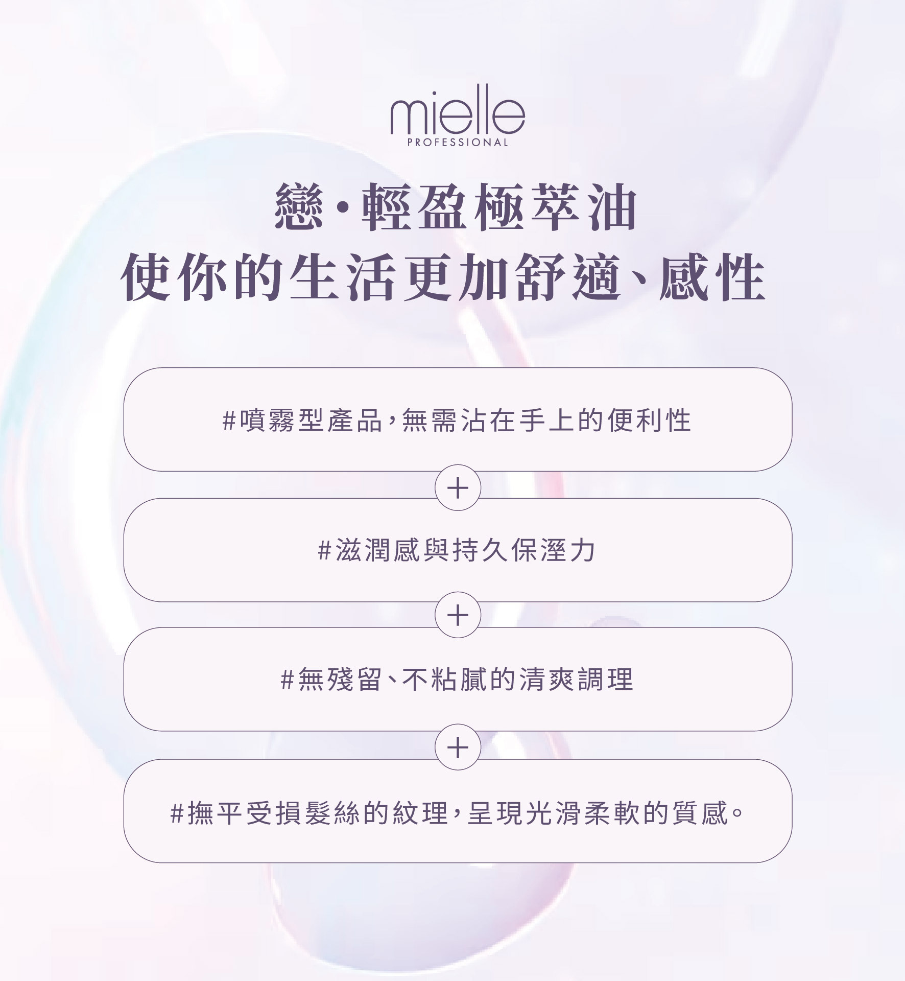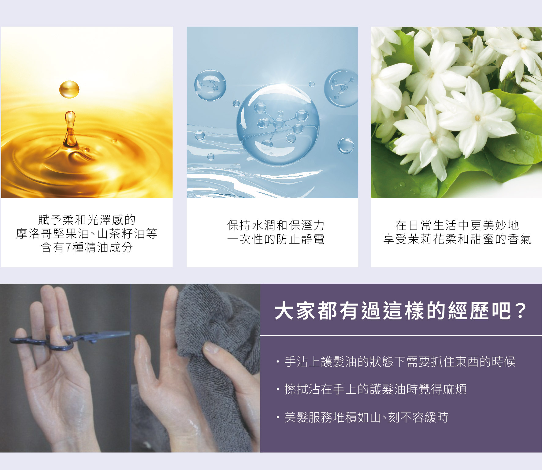便利的噴霧型解決護髮油強效調理問題,茉莉花的柔和甜美香氛,含7種油脂成分,能維持秀髮水分並防止靜電,提供柔和光澤和調理效果。