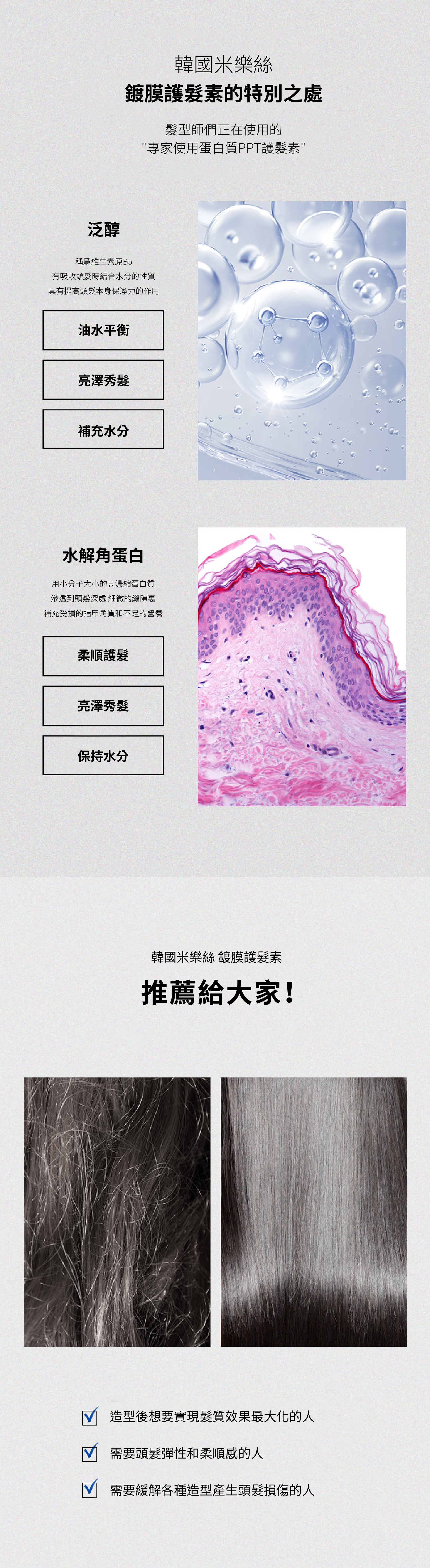居家護髮產品,可立即改善髮質多孔,填補蛋白質並覆蓋在頭髮上,使用天然的脫乙酰殼多醣聚合物來增加頭髮的水分,防止頭髮粗糙,殼聚醣、泛酸醇可保持頭髮上的光澤和色彩。