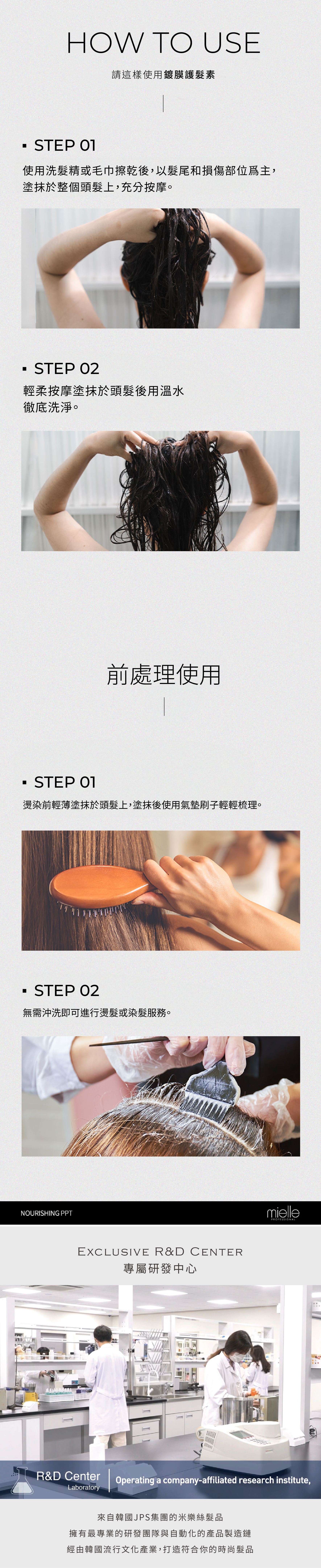 均勻塗抹在洗淨的受損髮上,停留約5-8分鐘後完全沖淨即可。