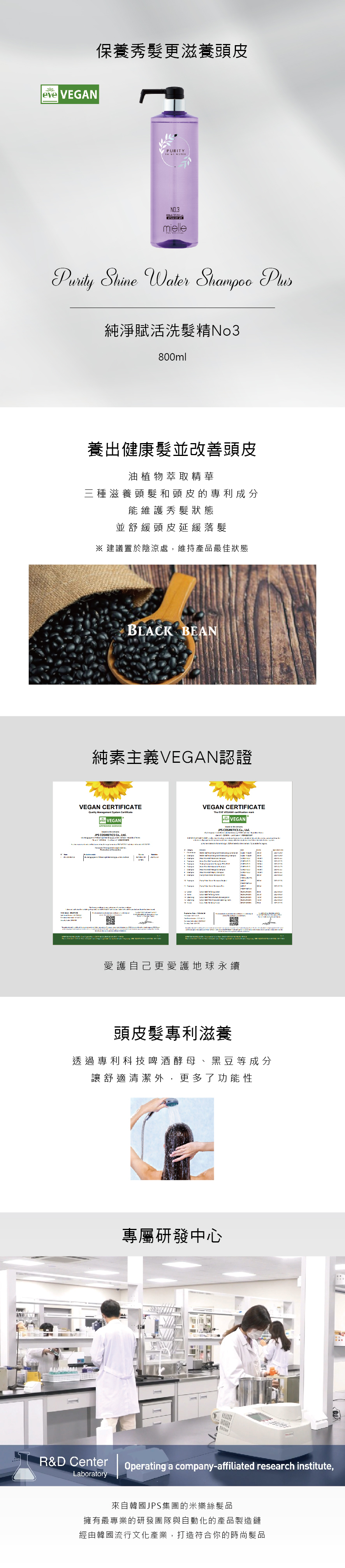 VEGAN維根主義產品,由植物萃取的溫和清潔洗髮精,髮量稀少、細軟髮適用,含有右旋泛醇,煙酰胺,生物素,角蛋白和各種蛋白質,可改善頭皮狀況並延緩落髮,三種滋養頭髮和頭皮的專利成分(啤酒酵母,黑豆等)處方,能放鬆舒緩頭皮。