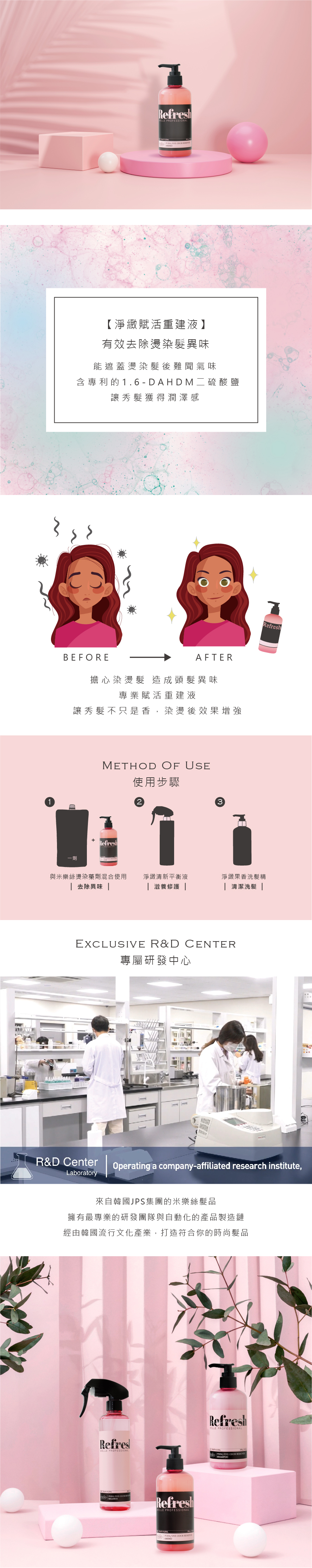 能使用在任何階段的除臭滋養液,含專利的1.6-DAHDM 二硫酸鹽能去除異味,使用後可讓秀髮獲得潤澤感,讓燙髮更加立體、染髮色彩更加鮮明,加入燙染藥劑 1/10。