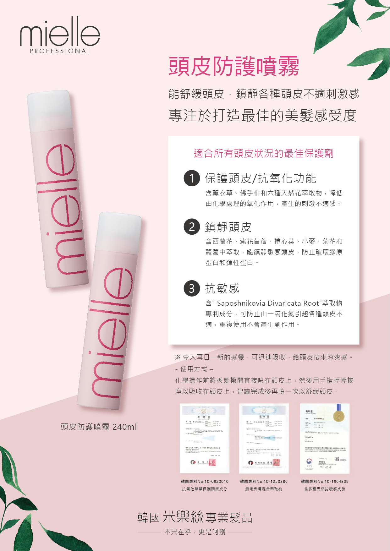 頭皮隔離防護,含薰衣草、佛手柑和六種花類萃取,降低化學處理產生的刺激不適感,專利Saposhnikovia Divaricata Root萃取成分,可防止由一氧化氮引起的不適感,重複使用不會產生副作用。